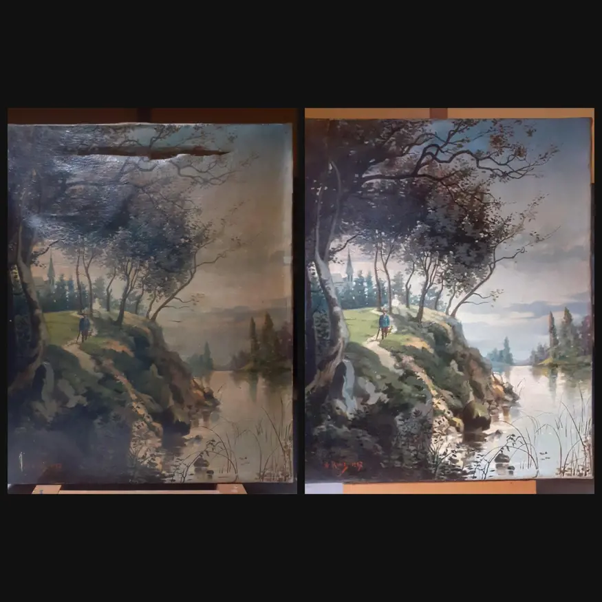 J'interviens sur tous types de peintures (huile, acrylique et gouache), sur tous types de supports (toile, bois, carton...) et sur toutes les dégradations que peuvent subir les peintures : encrassement, jaunissement, déchirures, déformations, écaillage,